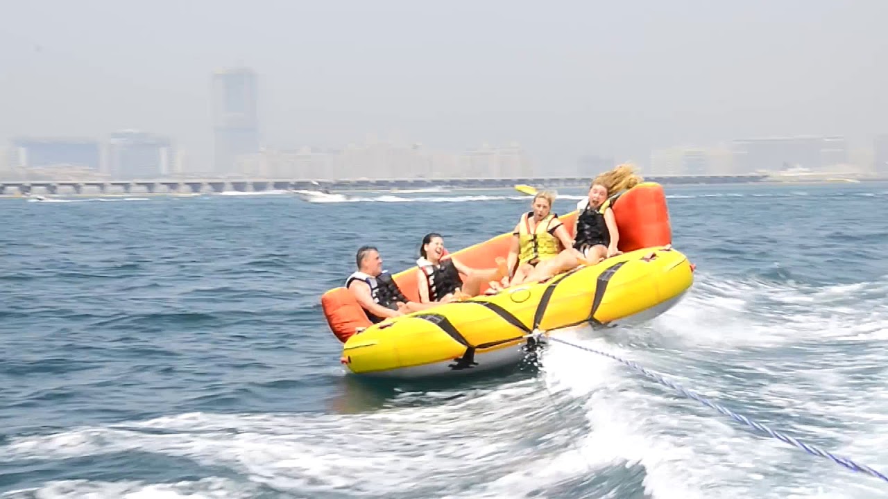 Donut ride is a fun-filled activity which visitors can enjoy during their family vacation in Dubai. It is similar to a banana boat, although it stands out for its unique and brightly colored donut shape. Moreover, contrary to a banana boat, it offers a great sense of security with very less chance of falling out into the water. Regardless of adults or kids or young or old, almost anyone above 10 years can hop aboard this round inflatable boat, which will be drawn by a speedboat or a personal water craft along the beautiful shoreline of Dubai. Depending on your age and unique ride preferences, your donut boat will give you an exhilarating ride, twisting and rotating you in the middle of the sea. While it can seat up to two to four people at a time, it’s vital to make sure that the number of passengers on its either side are same. Contact us to know more about this incredibly exciting and enjoyable water activity .
